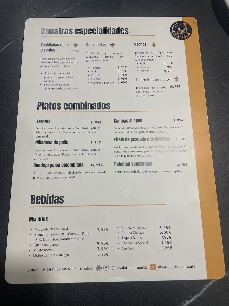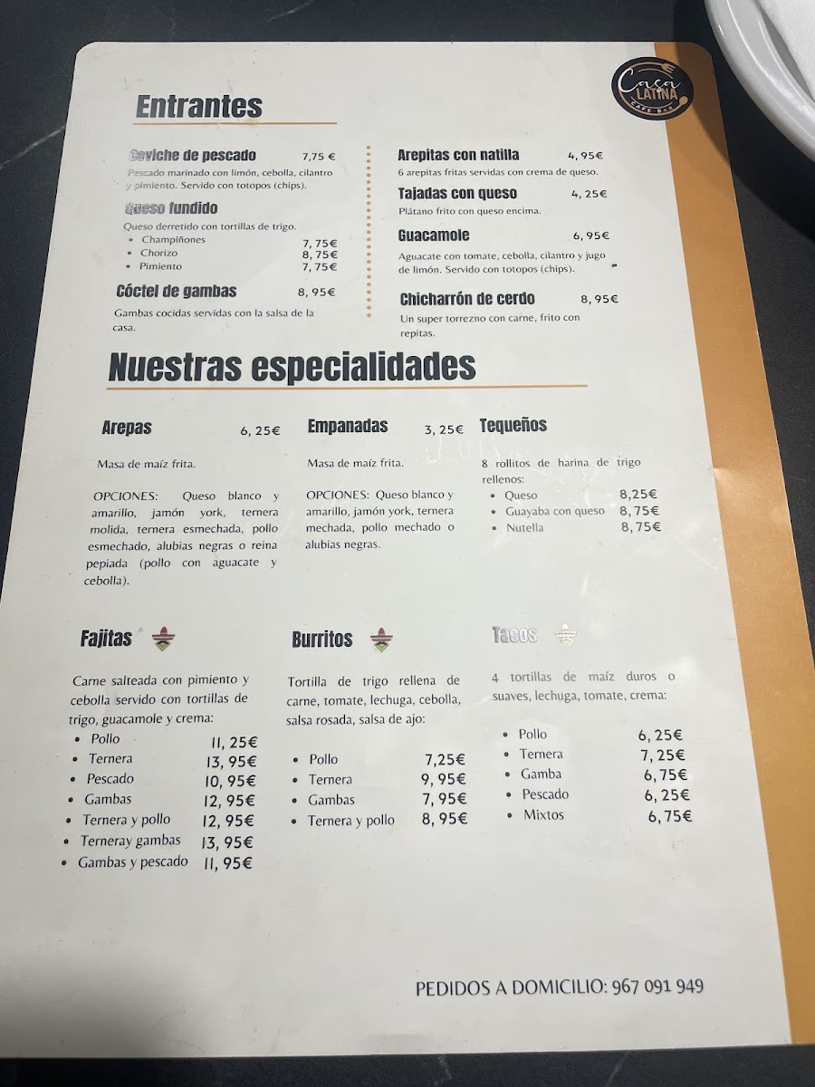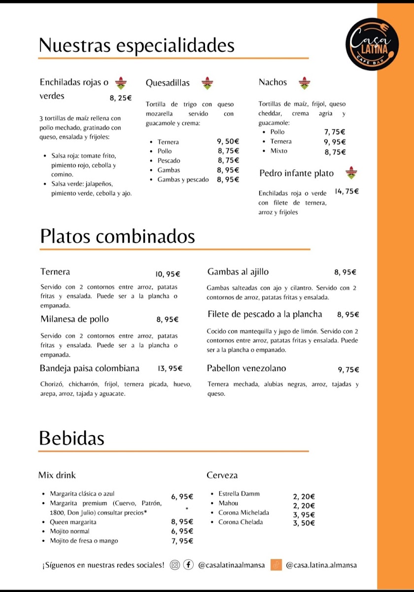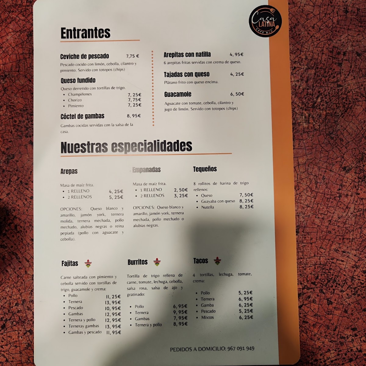 CASA LATINA RESTAURANTE in Almansa is a vibrant celebration of Latin American flavors, blending Colombian, Mexican, and Venezuelan culinary traditions. The menu boasts authentic, homemade dishes crafted with care, making every bite a heartfelt experience. Signature highlights include crispy, seasoned nachos perfect for sharing, and traditional arepas, a Venezuelan staple that brings a comforting, rustic appeal to the table.