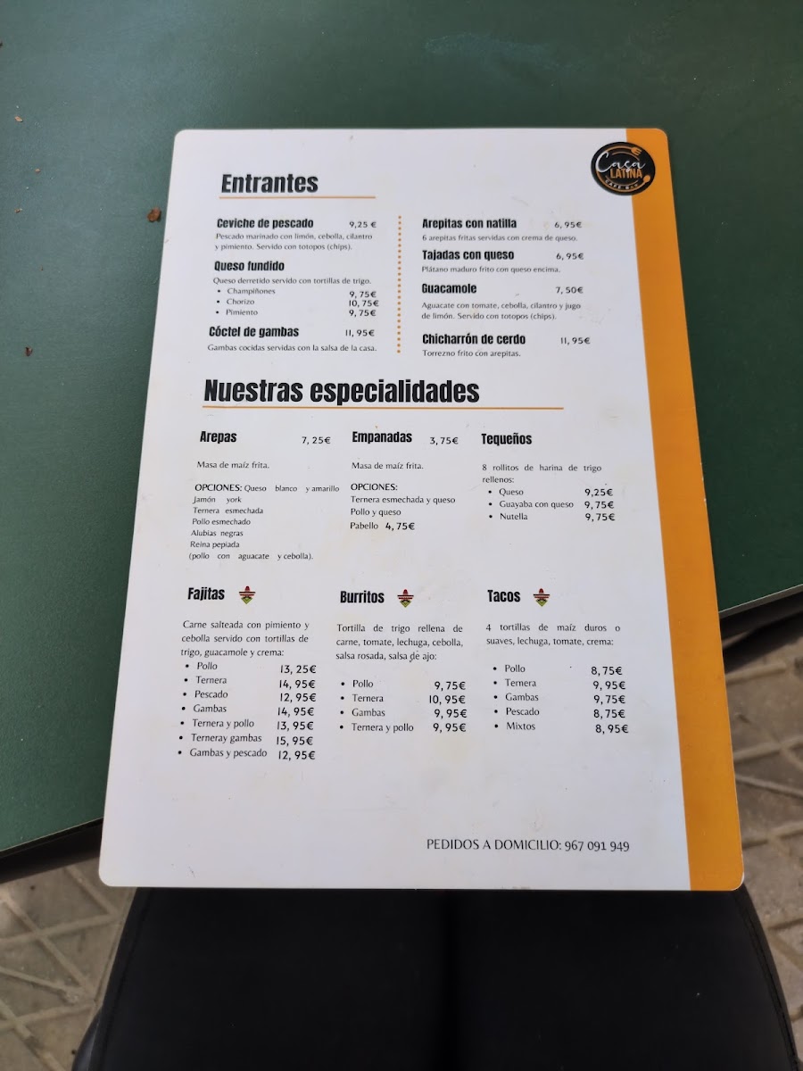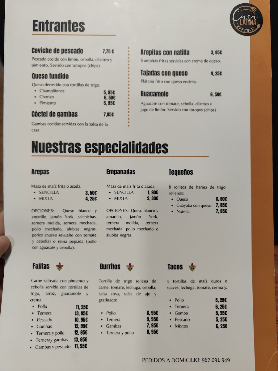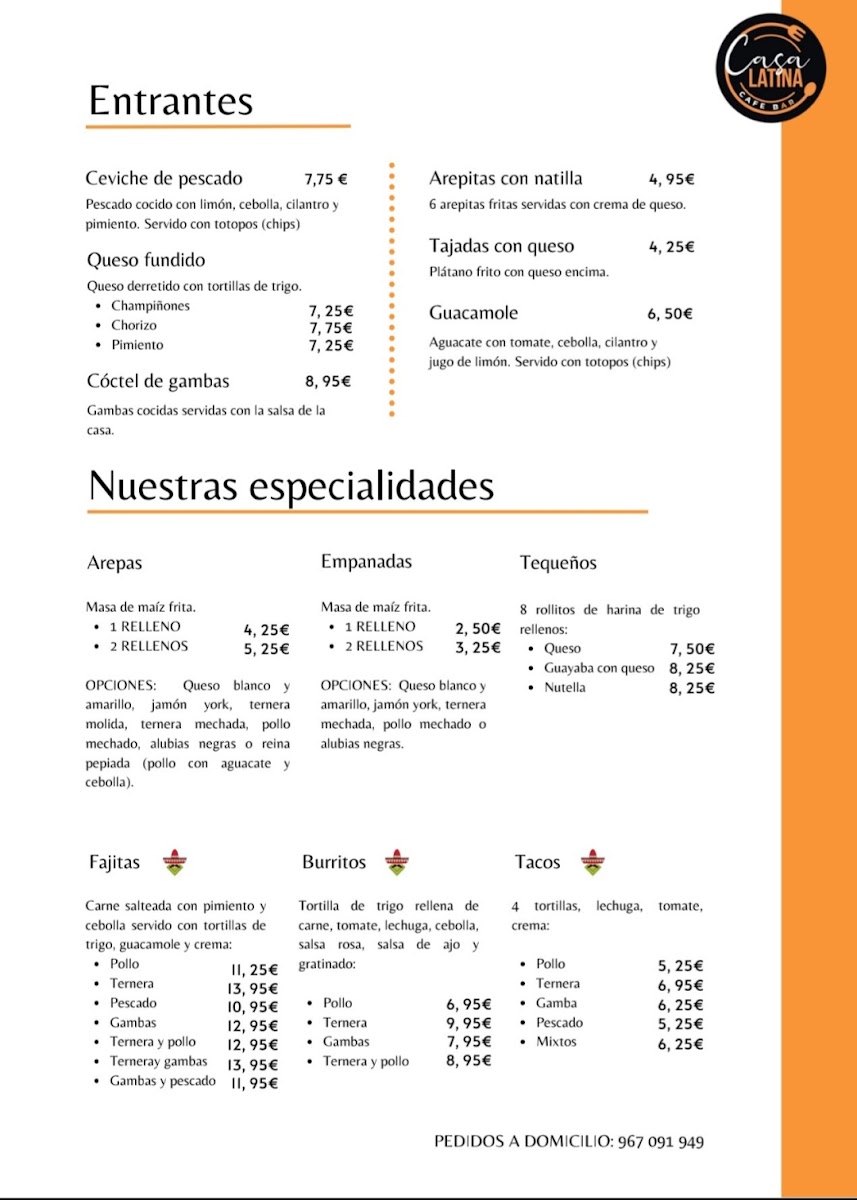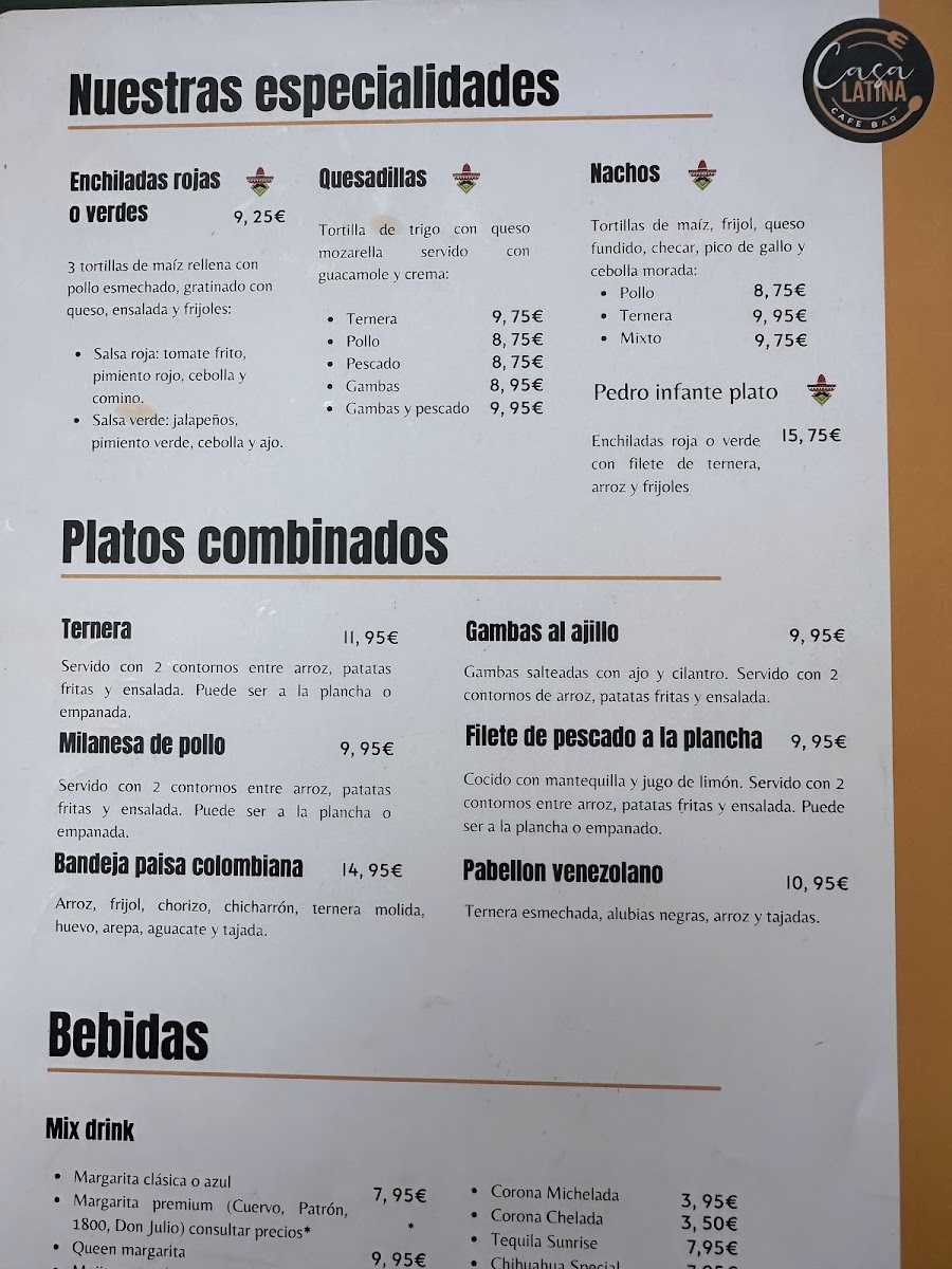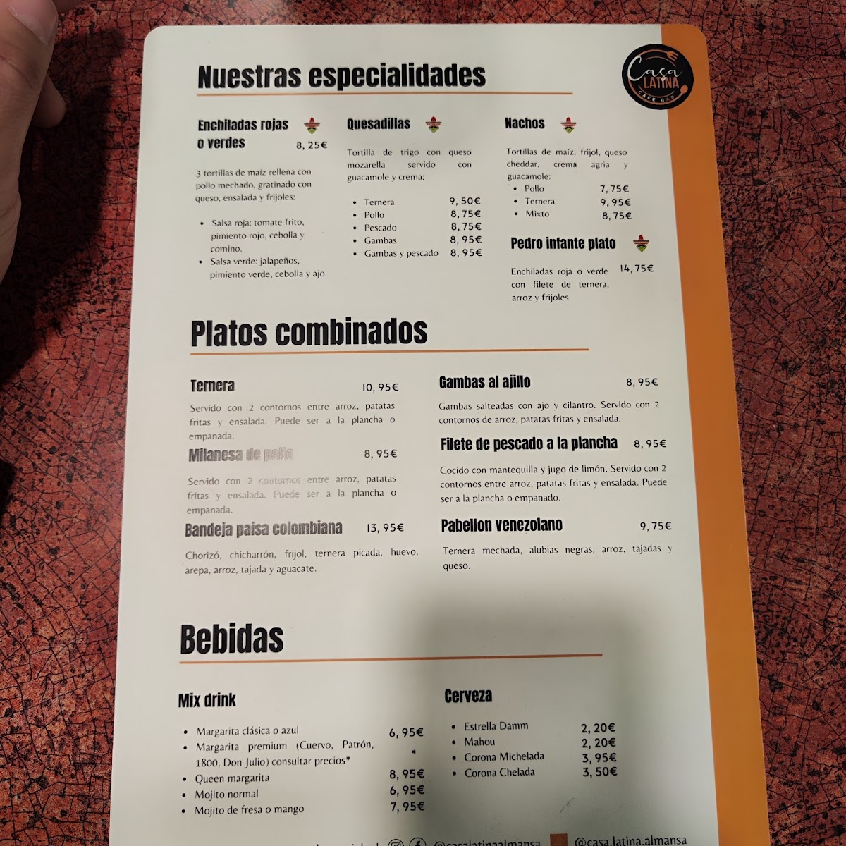 CASA LATINA RESTAURANTE in Almansa is a vibrant celebration of Latin American flavors, blending Colombian, Mexican, and Venezuelan culinary traditions. The menu boasts authentic, homemade dishes crafted with care, making every bite a heartfelt experience. Signature highlights include crispy, seasoned nachos perfect for sharing, and traditional arepas, a Venezuelan staple that brings a comforting, rustic appeal to the table.